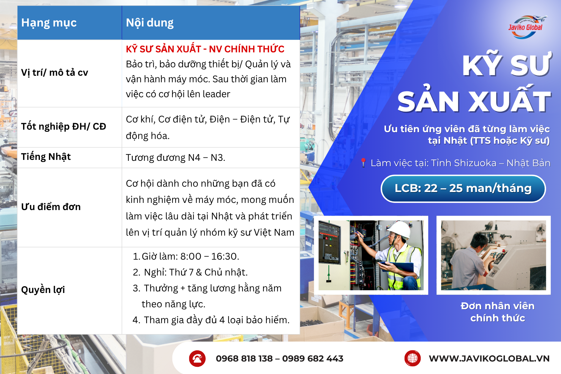 Tuyển Kỹ Sư Ngành Sản Xuất Tại – Cơ Hội Thăng Tiến Lên Leader Tại Shizuoka Nhật Bản