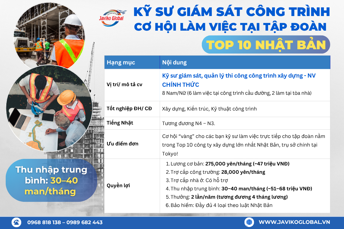 KỸ SƯ GIÁM SÁT CÔNG TRÌNH THU NHẬP 30 MAN– TẬP ĐOÀN XÂY DỰNG TOP 10 NHẬT BẢN