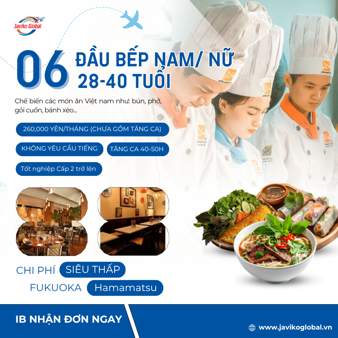 Tuyển Đầu Bếp Làm Việc Tại Fukuoka – 28 đến 40t – Phí Siêu Thấp – chỉ cần biết nấu ăn