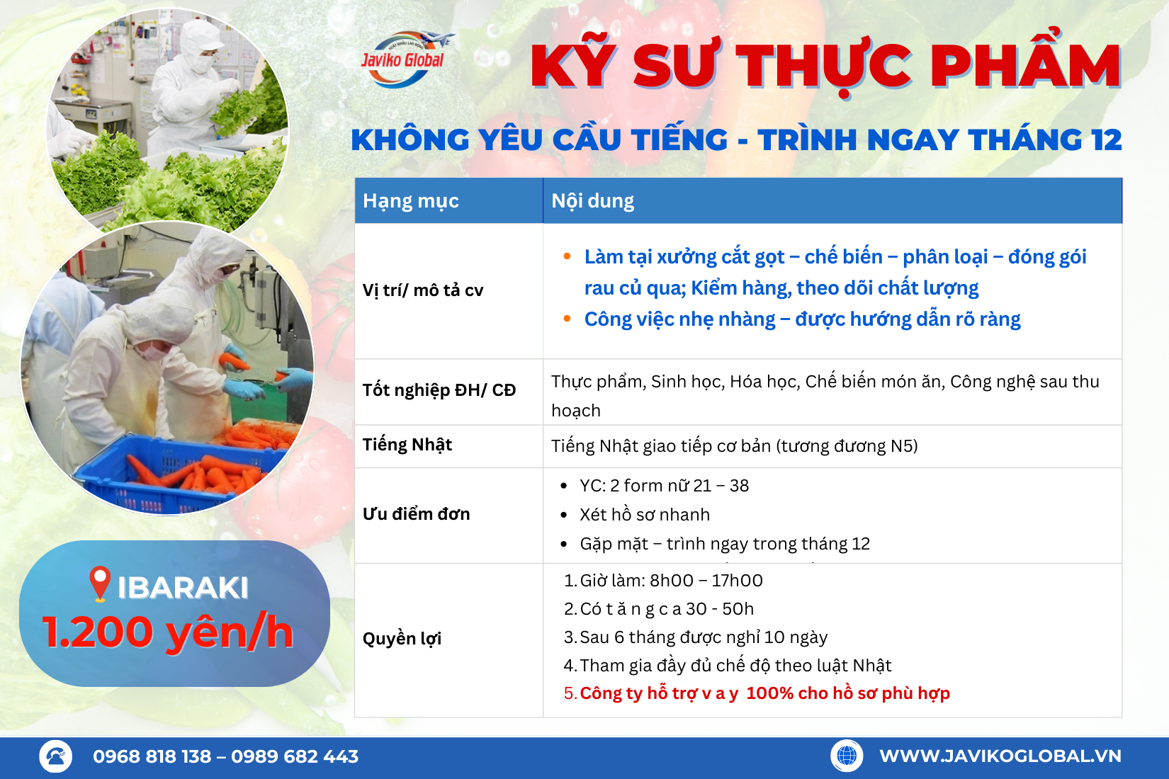 [GẤP – TRÌNH NGAY THÁNG 12] ĐƠN KỸ SƯ THỰC PHẨM IBARAKI – KHÔNG YÊU CẦU TIẾNG | HỖ TRỢ phí 100%