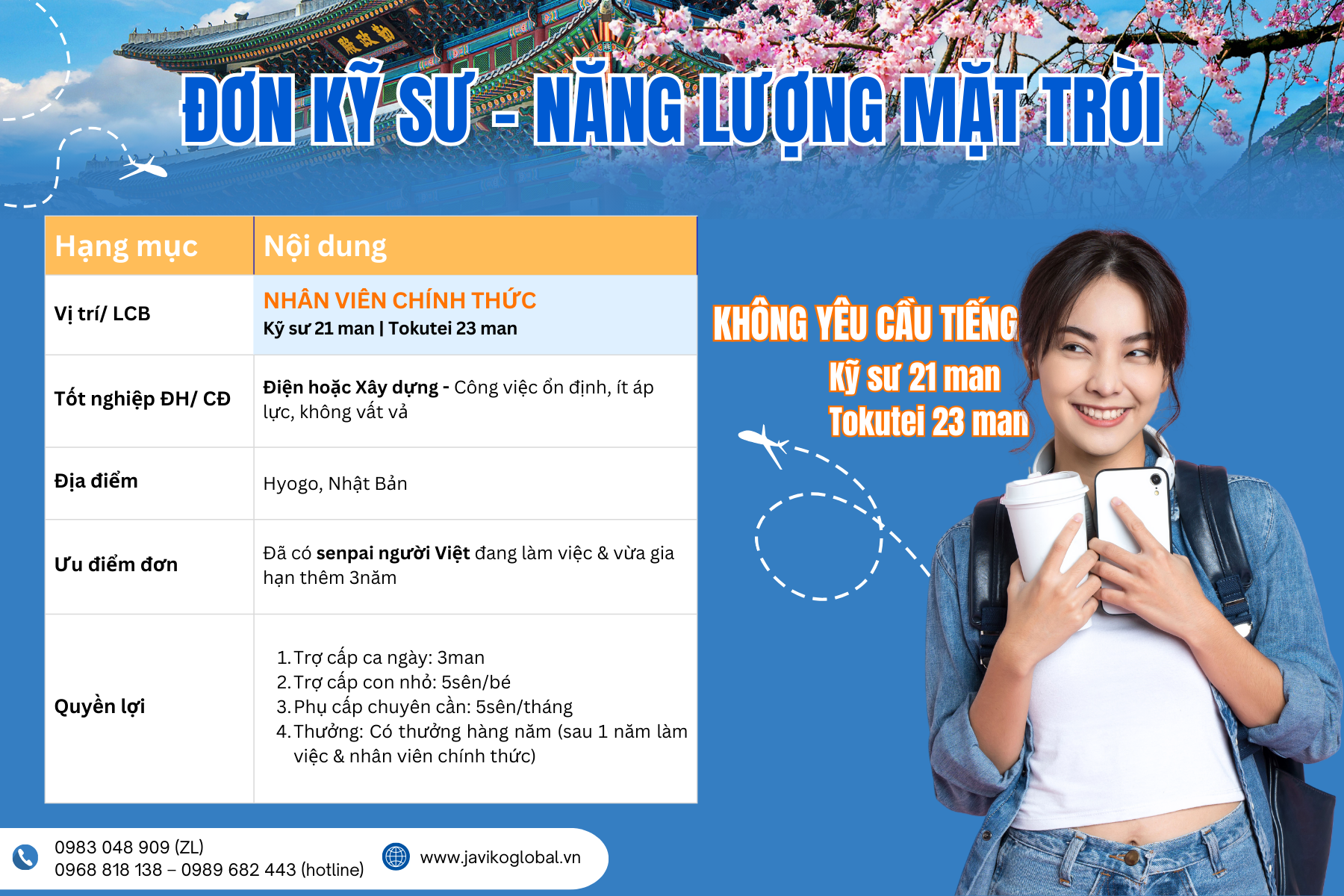 Javiko Global là biểu tượng uy tín về lĩnh vực Du Học và cung ứng nguồn nhân lực, lao động chuyên môn (kỹ sư, thực tập sinh) làm việc tại các công ty uy tín tại Nhật Bản, Hàn Quốc và Đài Loan. Trải qua nhiều năm hoạt động với nhiều khó khăn, nhiều thử thách, cộng vào đó được sự tin tưởng của các bạn kỹ sư, thực tập sinh, và đặc biệt là các bậc phụ huynh, JAVIKO GLOBAL đã gặt hái được những thành công nhất định đó là mỗi năm đưa trên 300 lao động phổ thông và trên 500 kỹ thuật viên xuất cảnh. Công Ty Cổ Phần JAVIKO GLOBAL với phương châm chọn lọc khắt khe các đơn hàng, môi trường làm việc tốt, lương cao, đa dạng ngành nghề như cơ khí, điện, điện tử, thực phẩm, dệt may, xây dựng,….