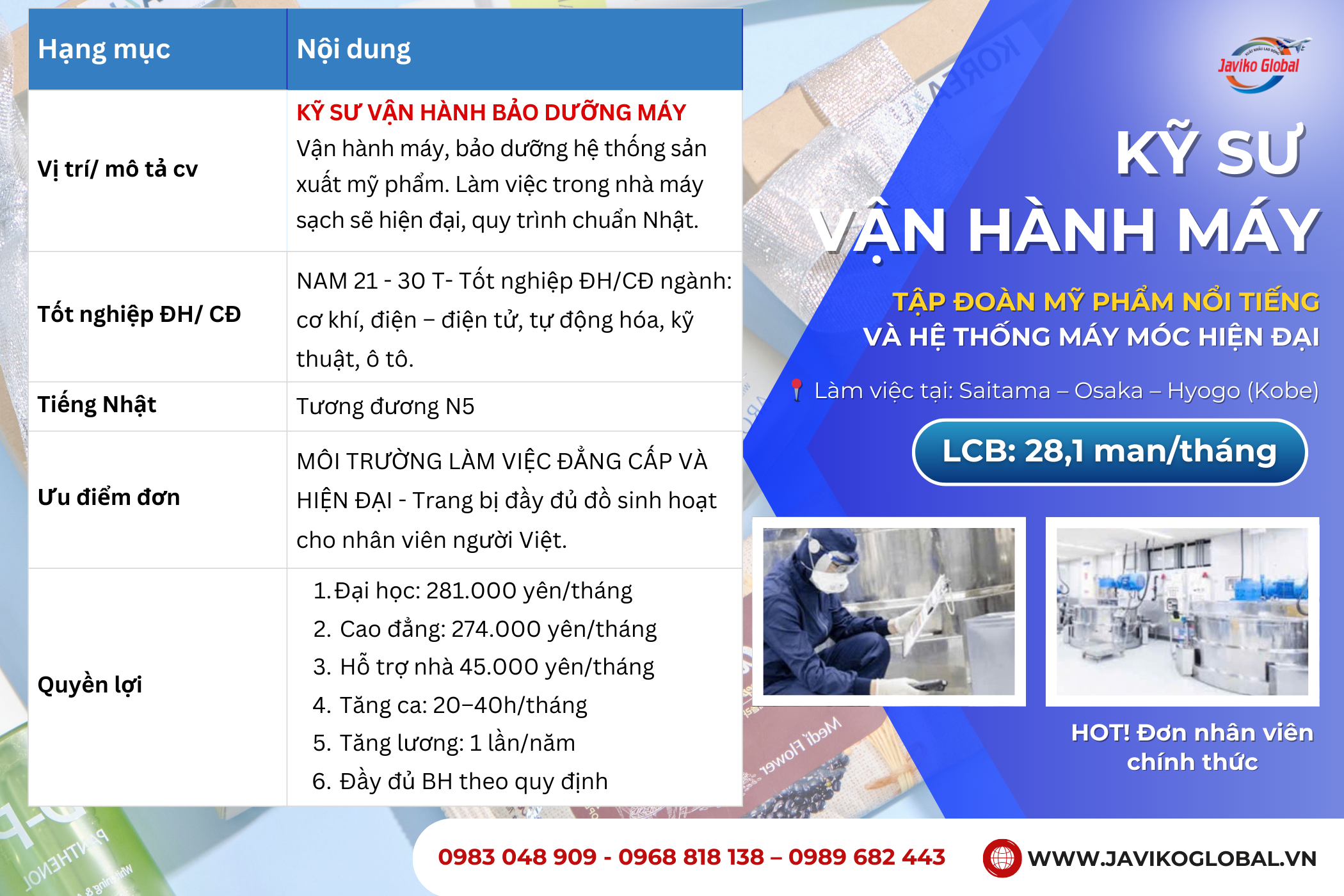 TUYỂN 25 KỸ SƯ VẬN HÀNH MÁY TẠI TẬP ĐOÀN MỸ PHẨM LỚN NHẬT BẢN | LƯƠNG 28 MAN/ THÁNG